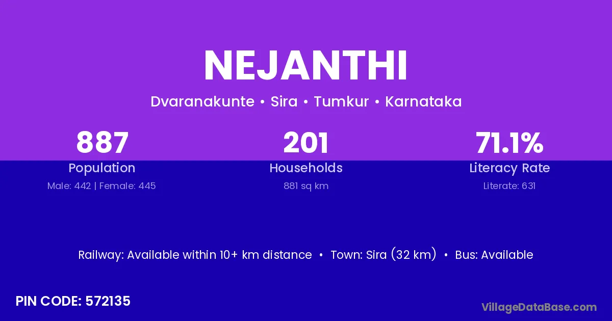 Sira (32 km) is the nearest town to Nejanthi village for major economic activities and is located approximately 32 km away.