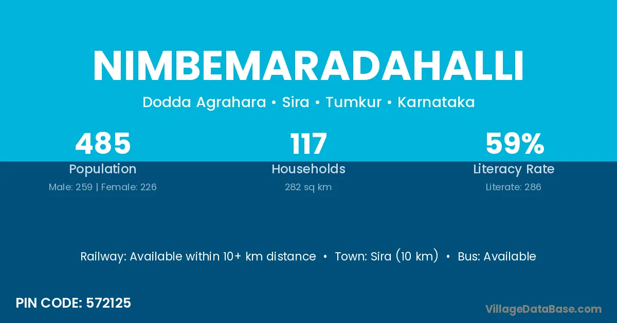 Sira (10 km) is the nearest town to Nimbemaradahalli village for major economic activities and is located approximately 10 km away.