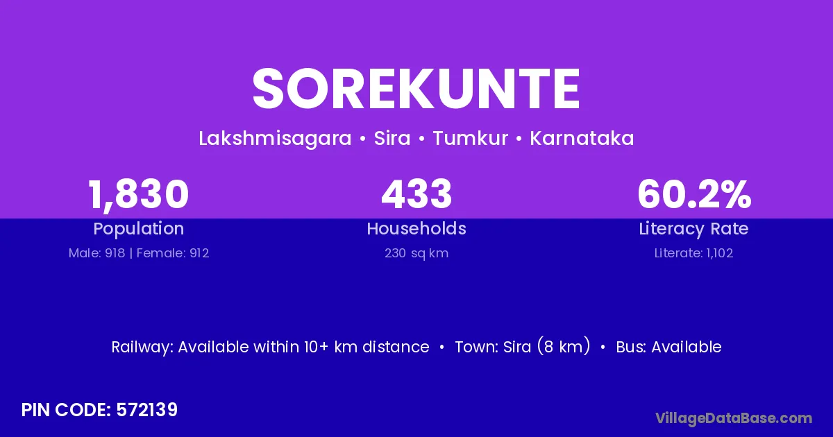 Sira (8 km) is the nearest town to Sorekunte village for major economic activities and is located approximately 8 km away.