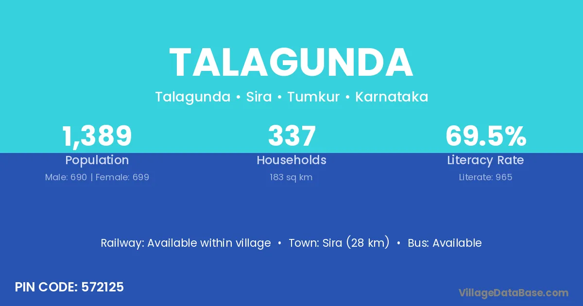 Talagunda village has a total population of 1,389 people, of which 690 are males and 699 are females.