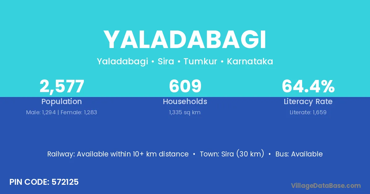 Sira (30 km) is the nearest town to Yaladabagi village for major economic activities and is located approximately 30 km away.