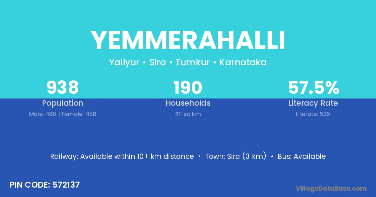 Sira (3 km) is the nearest town to Yemmerahalli village for major economic activities and is located approximately 3 km away.