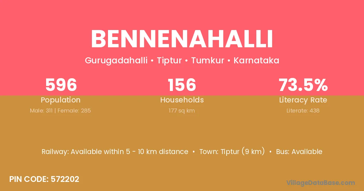 Tiptur (9 km) is the nearest town to Bennenahalli village for major economic activities and is located approximately 9 km away.