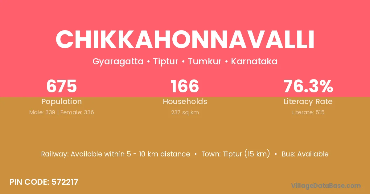 Tiptur (15 km) is the nearest town to Chikkahonnavalli village for major economic activities and is located approximately 15 km away.