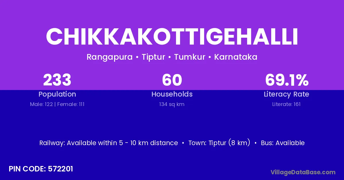 Tiptur (8 km) is the nearest town to Chikkakottigehalli village for major economic activities and is located approximately 8 km away.