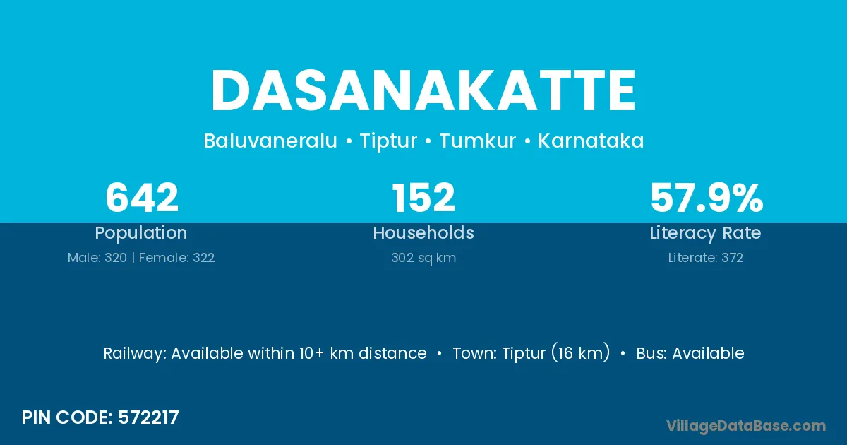 Tiptur (16 km) is the nearest town to Dasanakatte village for major economic activities and is located approximately 16 km away.