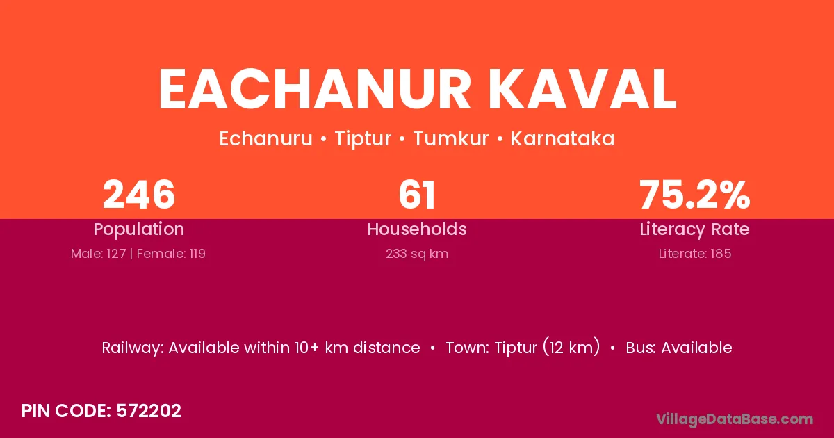 Tiptur (12 km) is the nearest town to Eachanur Kaval village for major economic activities and is located approximately 12 km away.