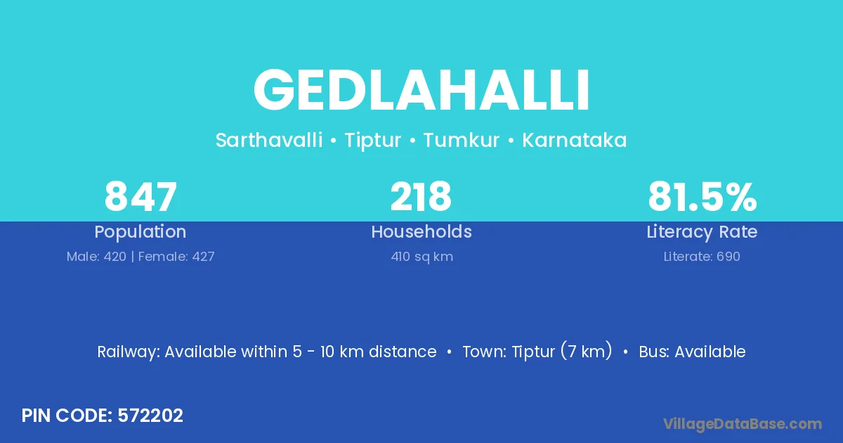 Tiptur (7 km) is the nearest town to Gedlahalli village for major economic activities and is located approximately 7 km away.