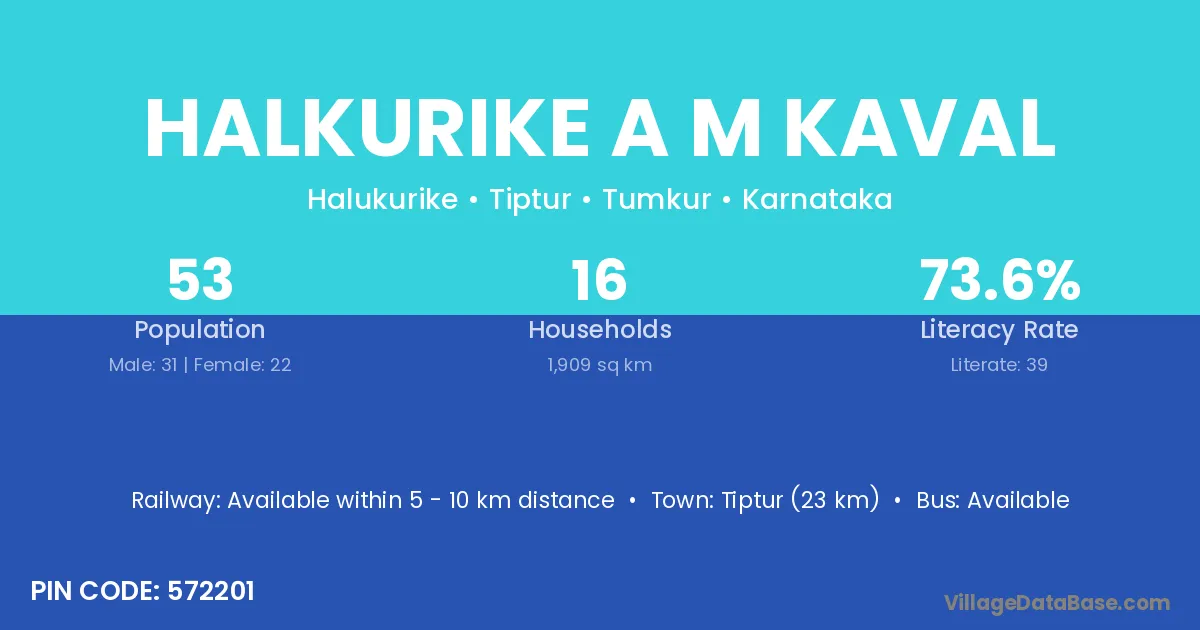Tiptur (23 km) is the nearest town to Halkurike A M Kaval village for major economic activities and is located approximately 23 km away.