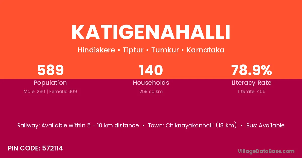 Katigenahalli village has a total population of 589 people, of which 280 are males and 309 are females.