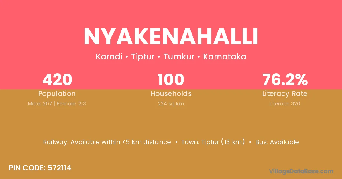 Tiptur (13 km) is the nearest town to Nyakenahalli village for major economic activities and is located approximately 13 km away.