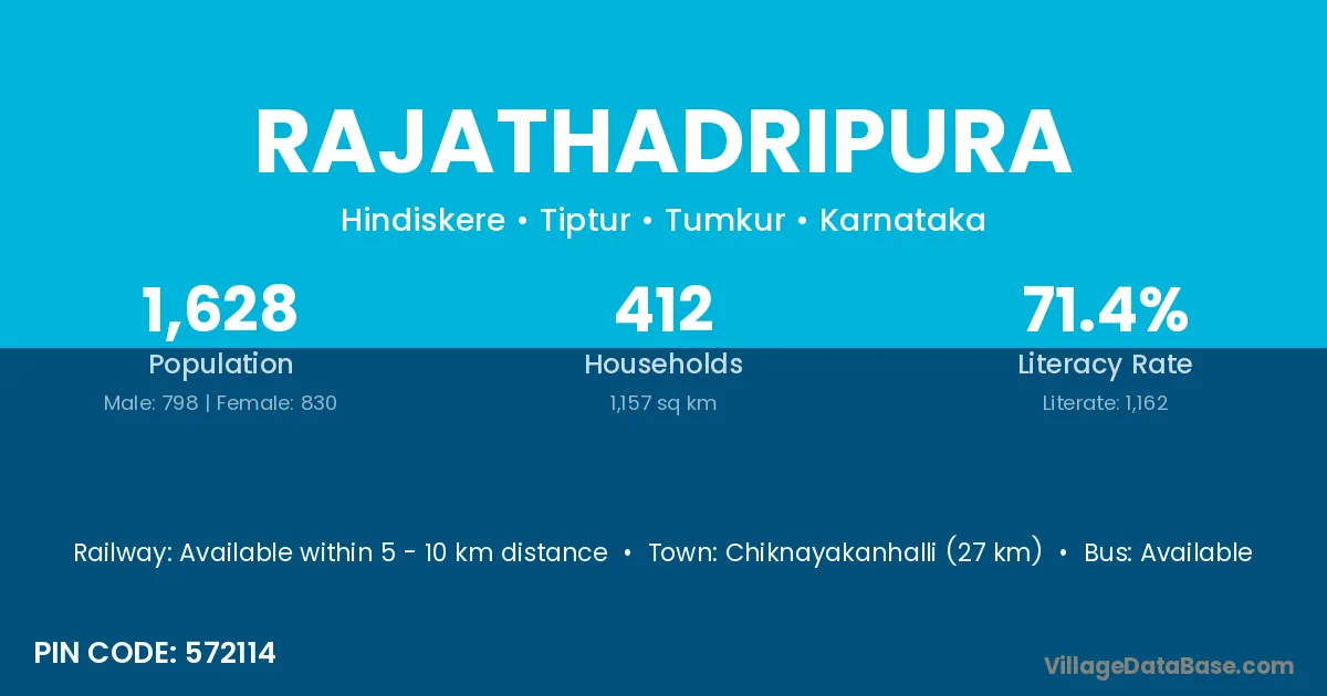 Chiknayakanhalli (27 km) is the nearest town to Rajathadripura village for major economic activities and is located approximately 27 km away.
