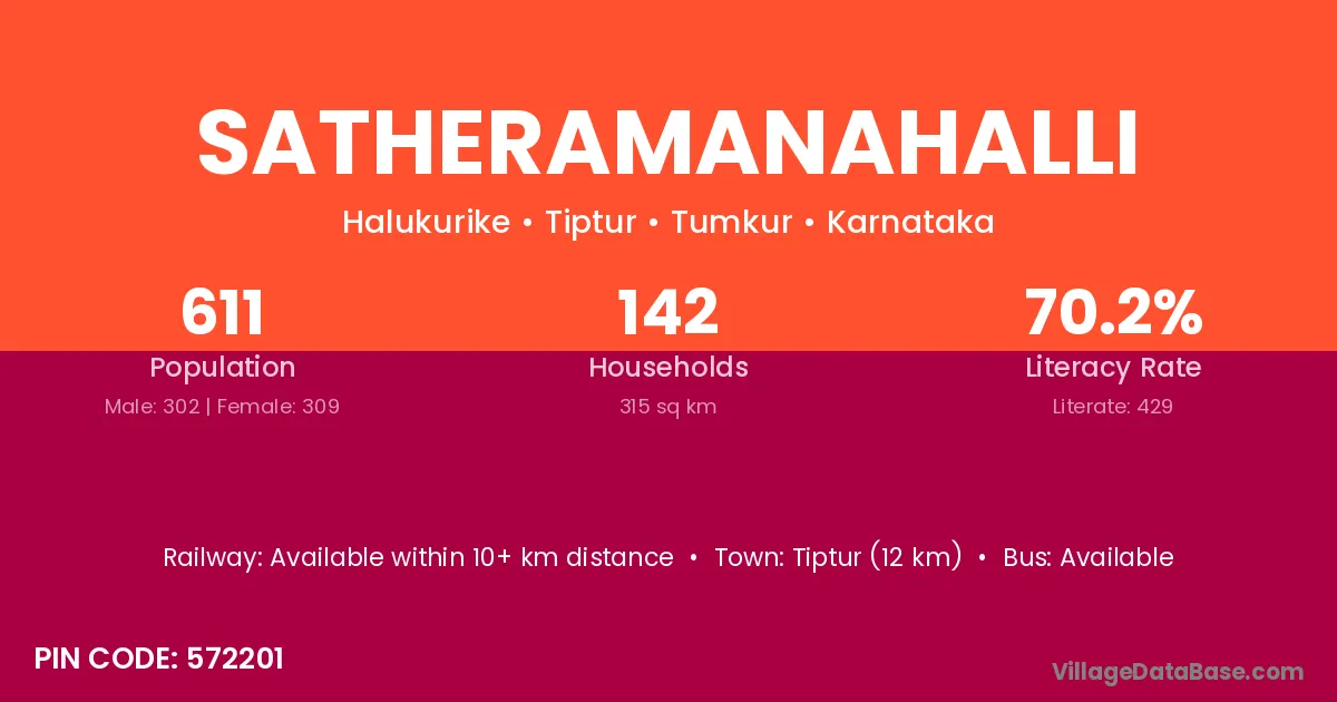 Tiptur (12 km) is the nearest town to Satheramanahalli village for major economic activities and is located approximately 12 km away.