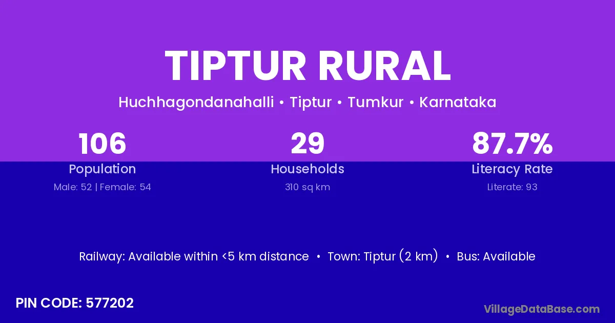 Tiptur (2 km) is the nearest town to Tiptur Rural village for major economic activities and is located approximately 2 km away.