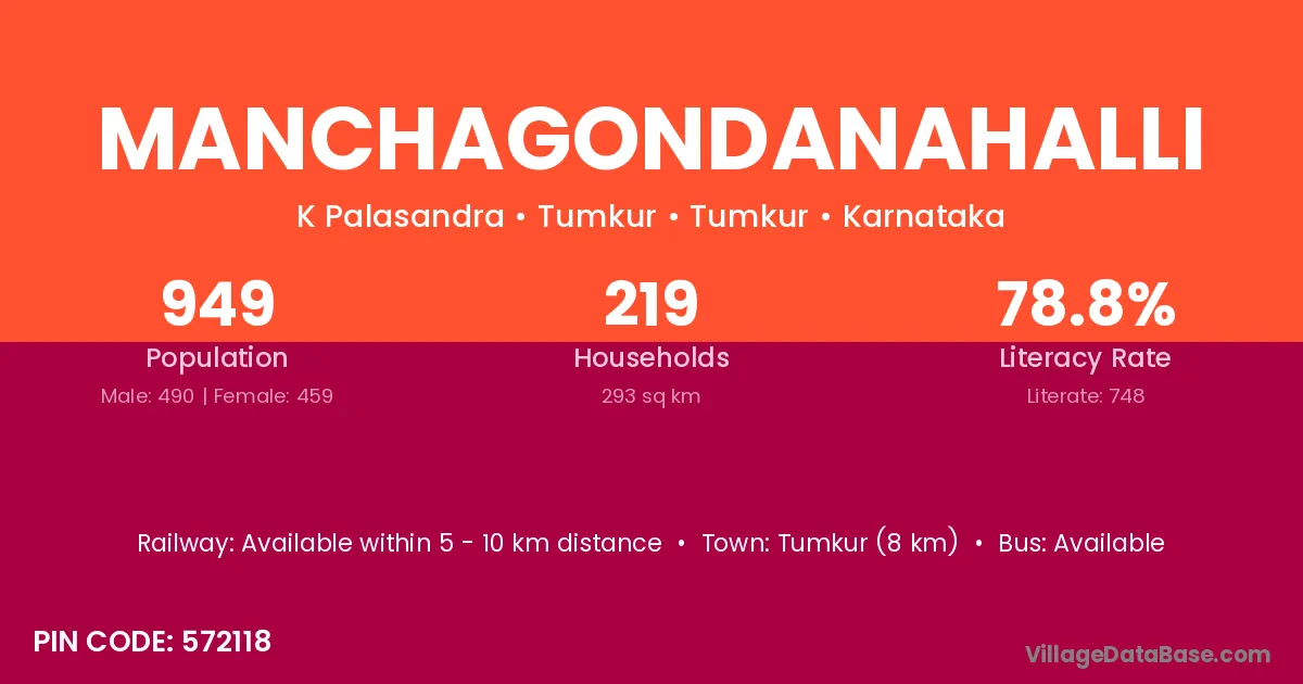 Manchagondanahalli village has a total population of 949 people, of which 490 are males and 459 are females.