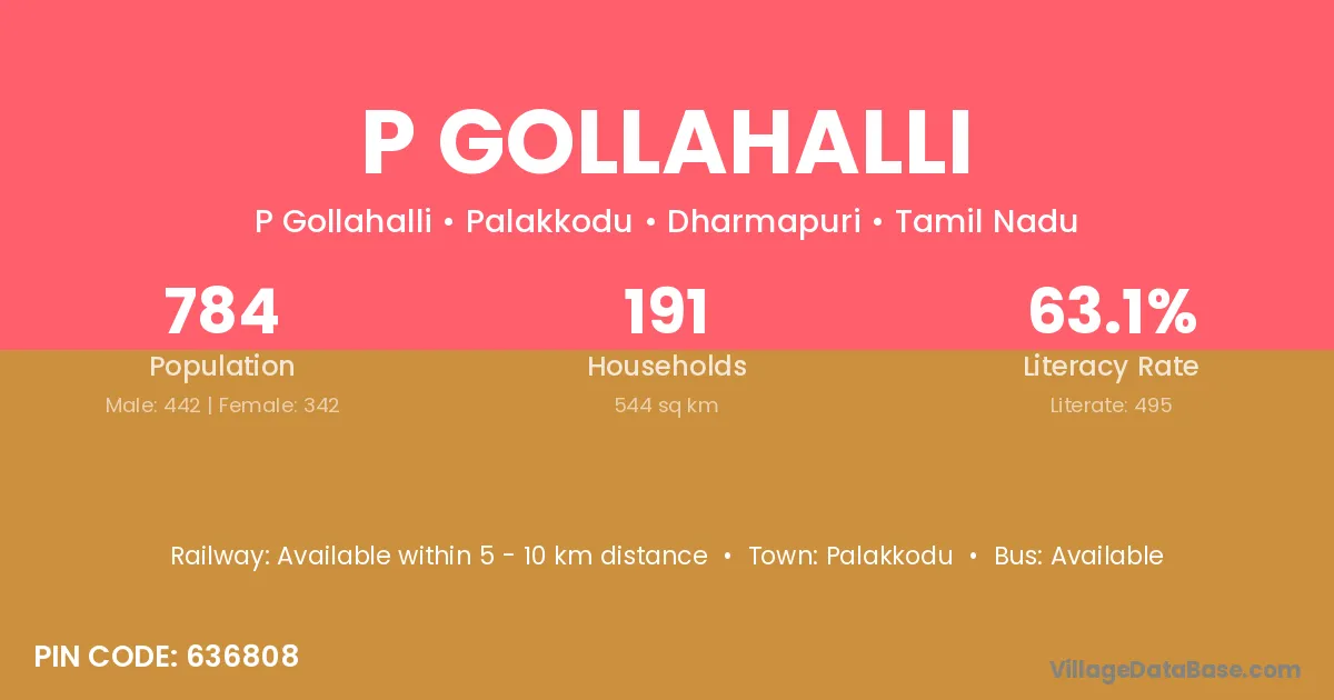 The literacy rate of P Gollahalli village is 60.26%. Male literacy stands at 67.44% and female literacy at 52.96%.