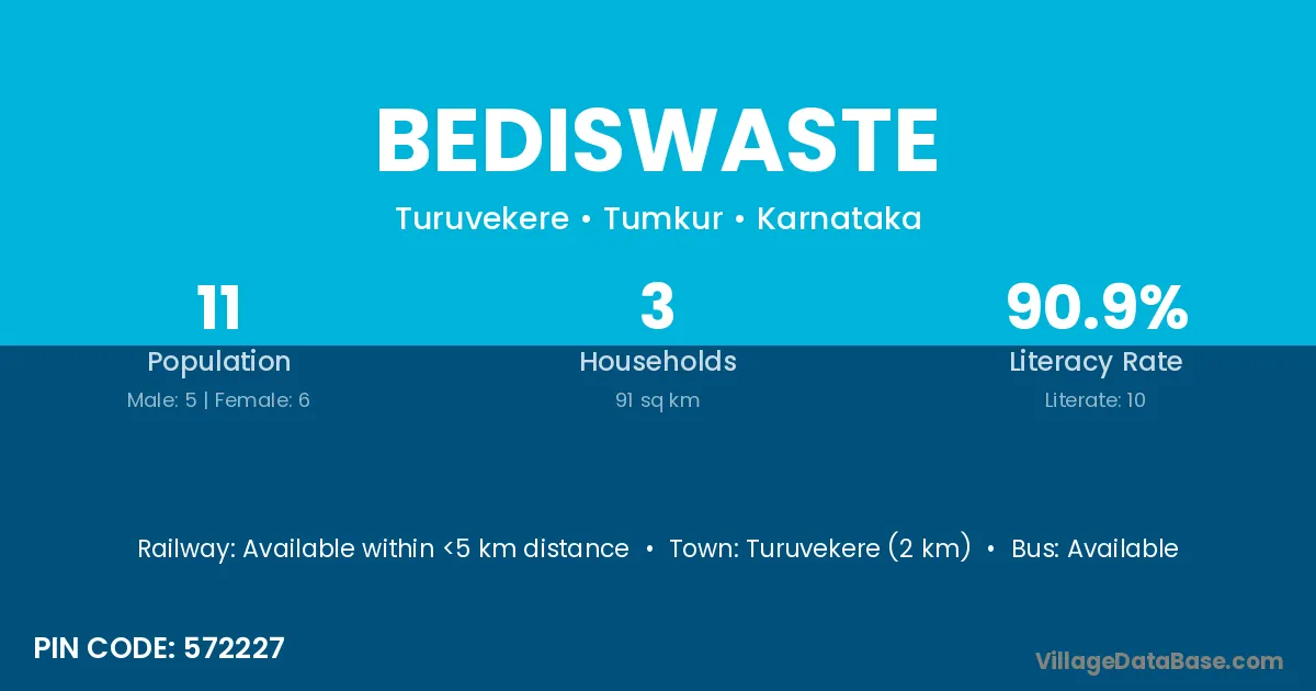 Turuvekere (2 km) is the nearest town to Bediswaste village for major economic activities and is located approximately 2 km away.