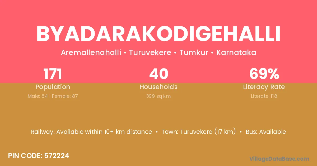 Turuvekere (17 km) is the nearest town to Byadarakodigehalli village for major economic activities and is located approximately 17 km away.