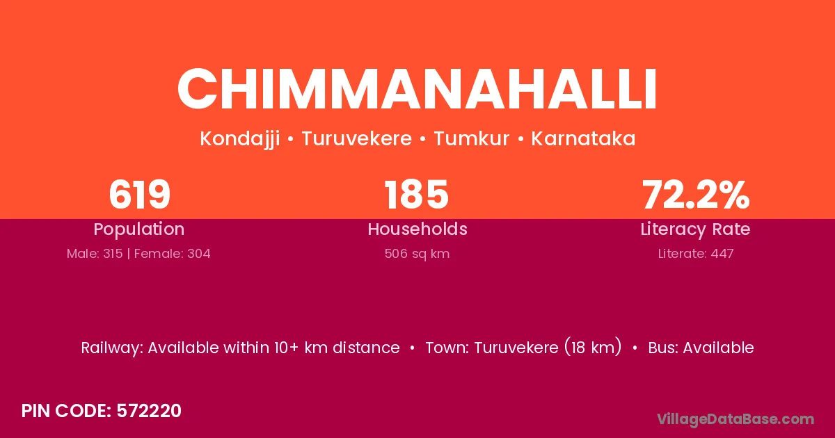 Chimmanahalli village has a total population of 619 people, of which 315 are males and 304 are females.