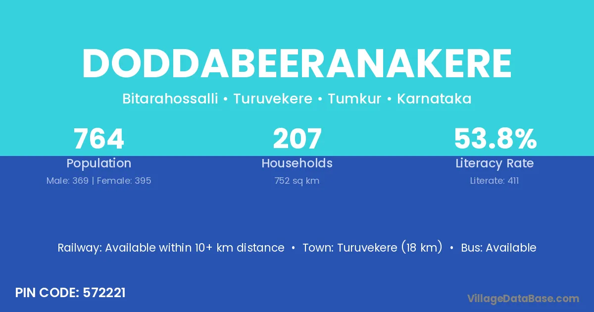 Doddabeeranakere village has a total population of 764 people, of which 369 are males and 395 are females.