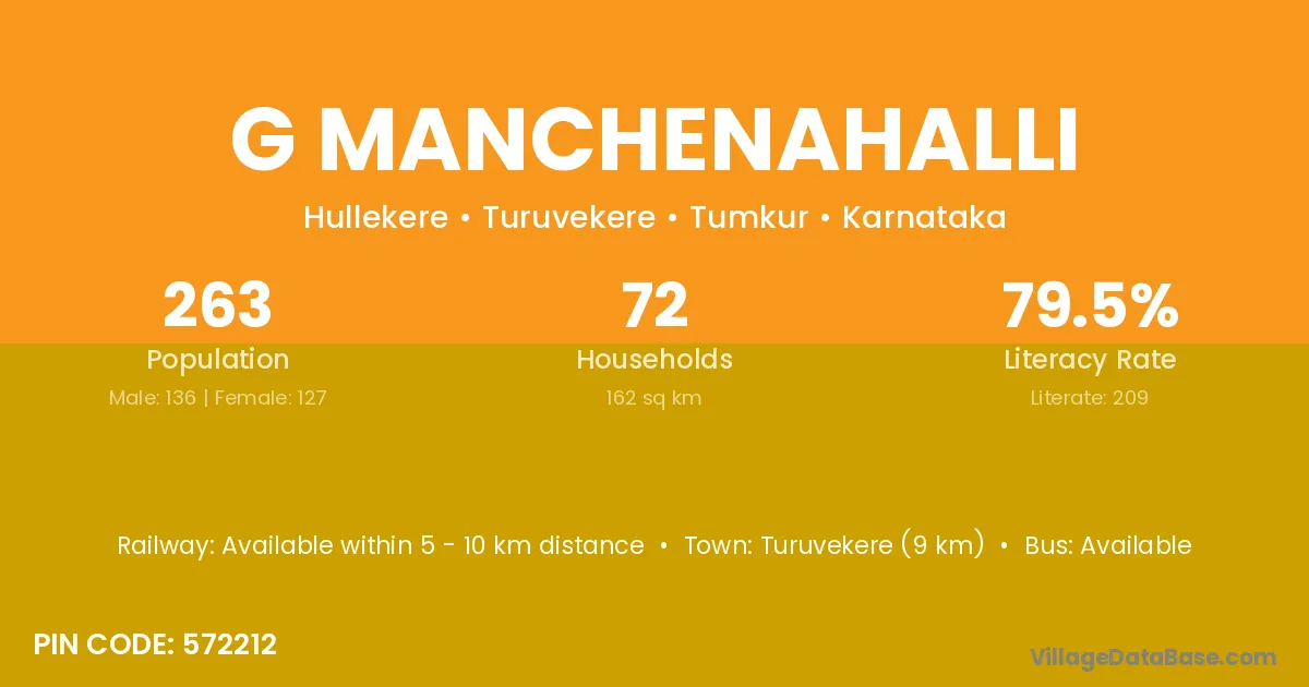 Turuvekere (9 km) is the nearest town to G Manchenahalli village for major economic activities and is located approximately 9 km away.
