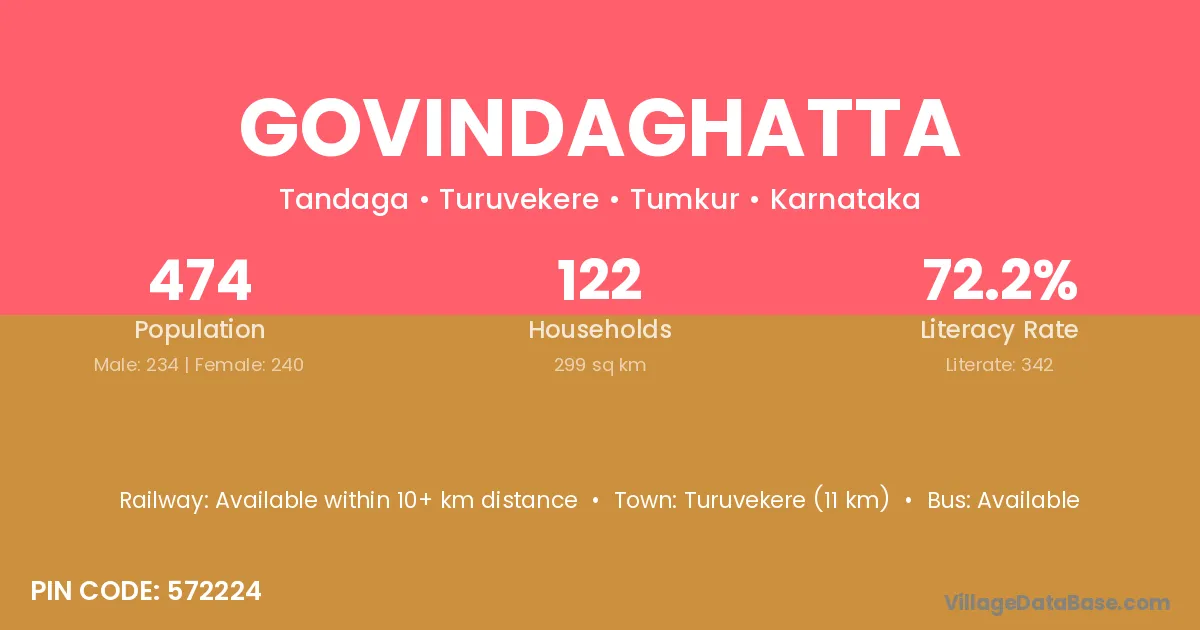 Govindaghatta village has a total population of 474 people, of which 234 are males and 240 are females.
