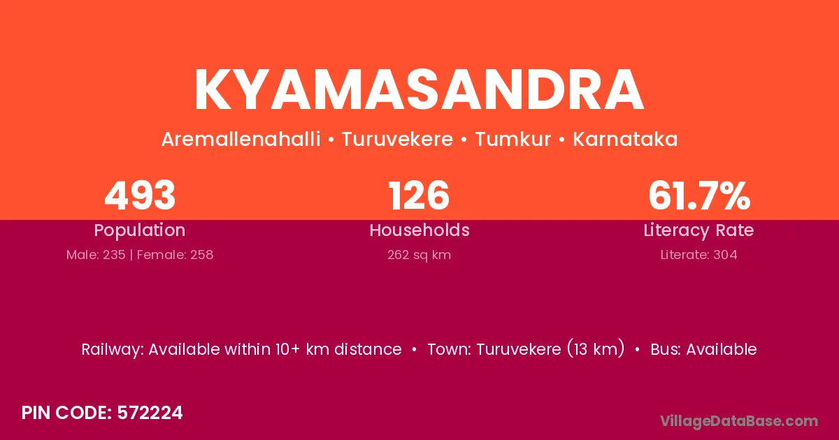 Kyamasandra village has a total population of 493 people, of which 235 are males and 258 are females.