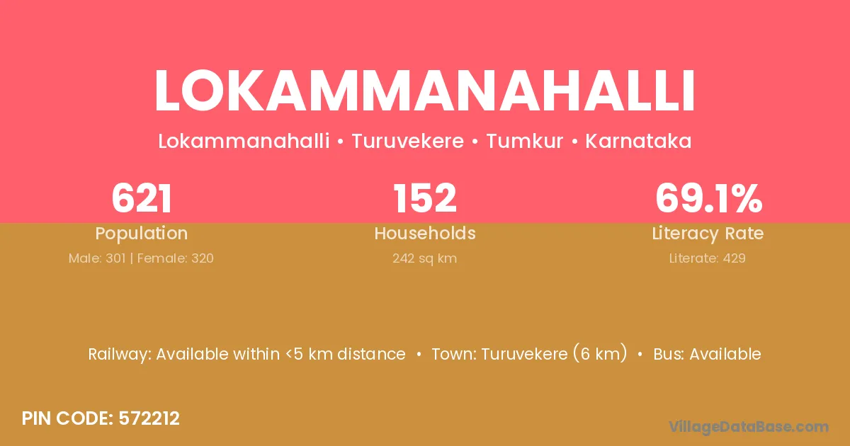 Lokammanahalli village has a total population of 621 people, of which 301 are males and 320 are females.