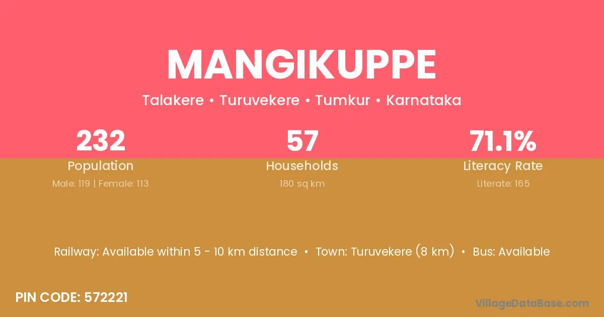 Turuvekere (8 km) is the nearest town to Mangikuppe village for major economic activities and is located approximately 8 km away.