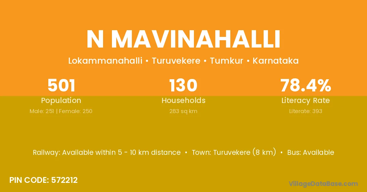 Turuvekere (8 km) is the nearest town to N Mavinahalli village for major economic activities and is located approximately 8 km away.