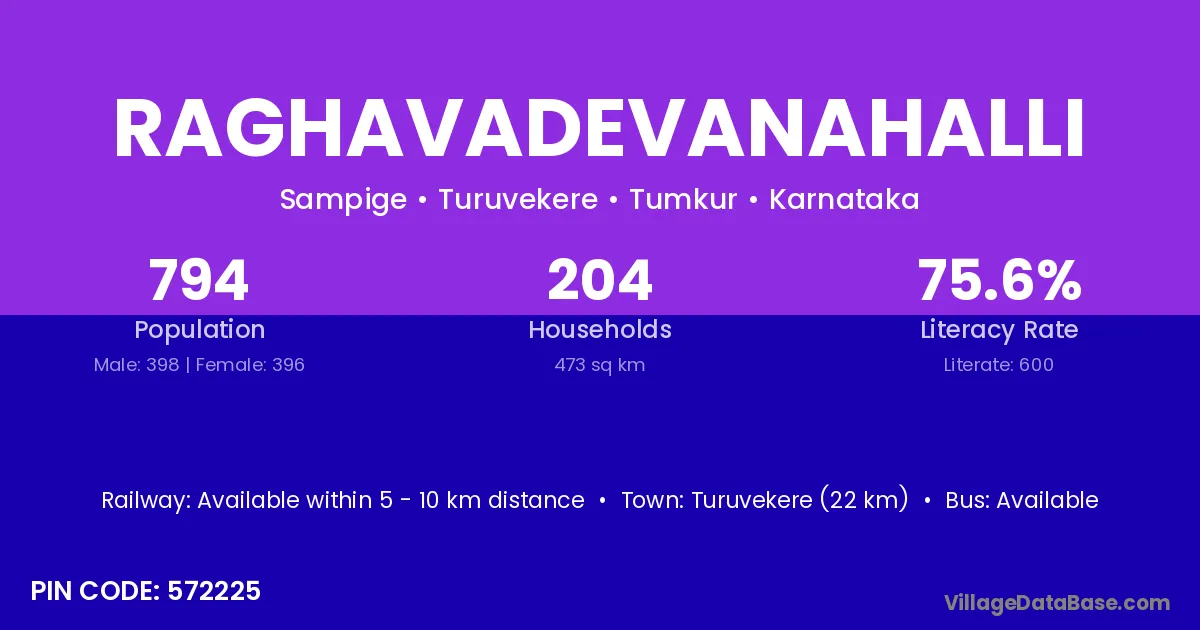 Raghavadevanahalli village has a total population of 794 people, of which 398 are males and 396 are females.