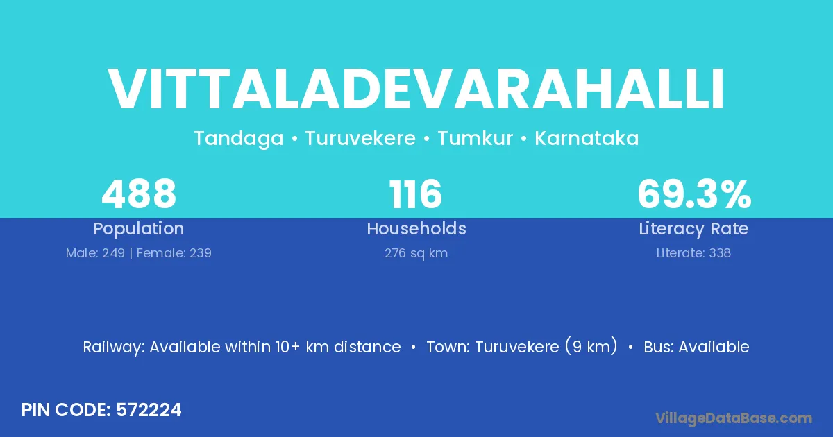 Vittaladevarahalli village has a total population of 488 people, of which 249 are males and 239 are females.