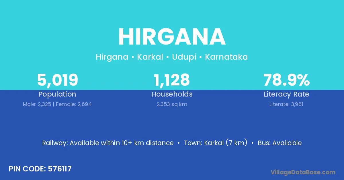 Karkal (7 km) is the nearest town to Hirgana village for major economic activities and is located approximately 7 km away.