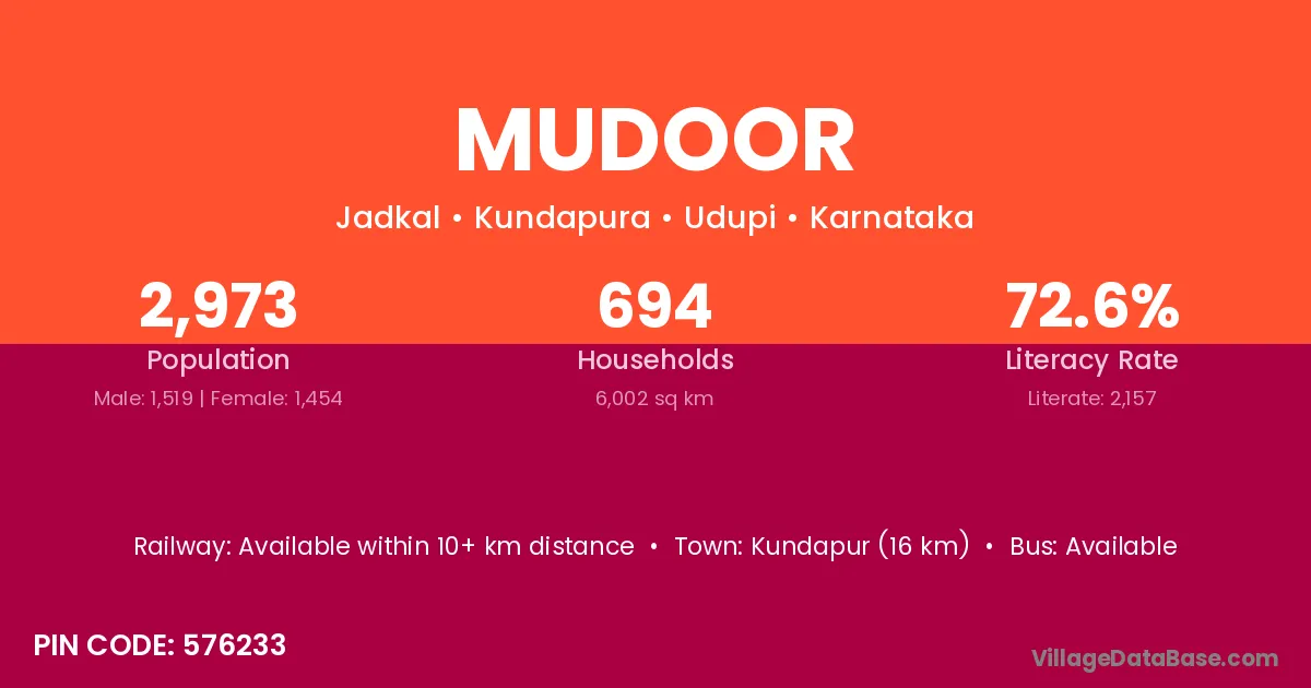 Kundapur (16 km) is the nearest town to Mudoor village for major economic activities and is located approximately 16 km away.