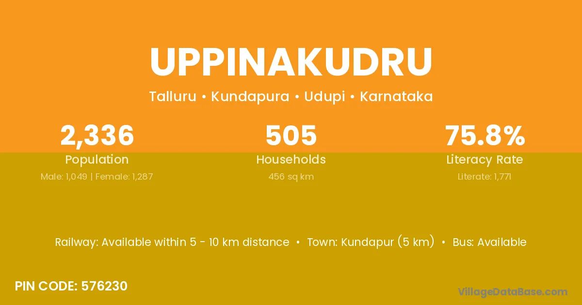 According to Census 2011 information, the village code of Uppinakudru village is 576230.