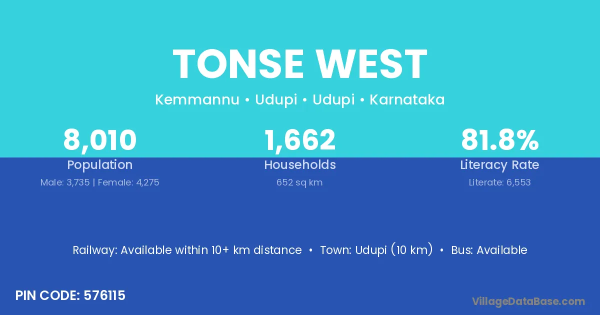 Udupi (10 km) is the nearest town to Tonse West village for major economic activities and is located approximately 10 km away.