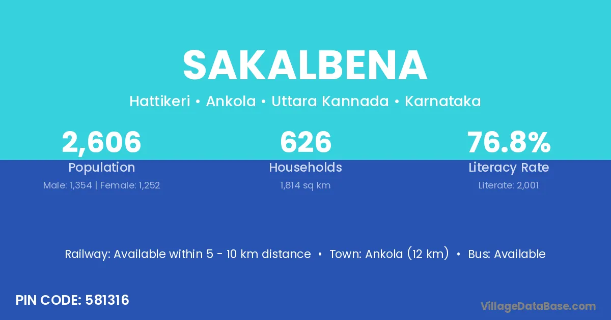 Ankola (12 km) is the nearest town to Sakalbena village for major economic activities and is located approximately 12 km away.