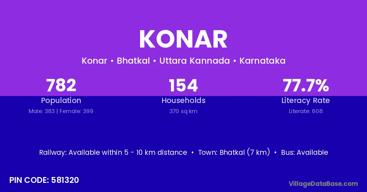Bhatkal (7 km) is the nearest town to Konar village for major economic activities and is located approximately 7 km away.