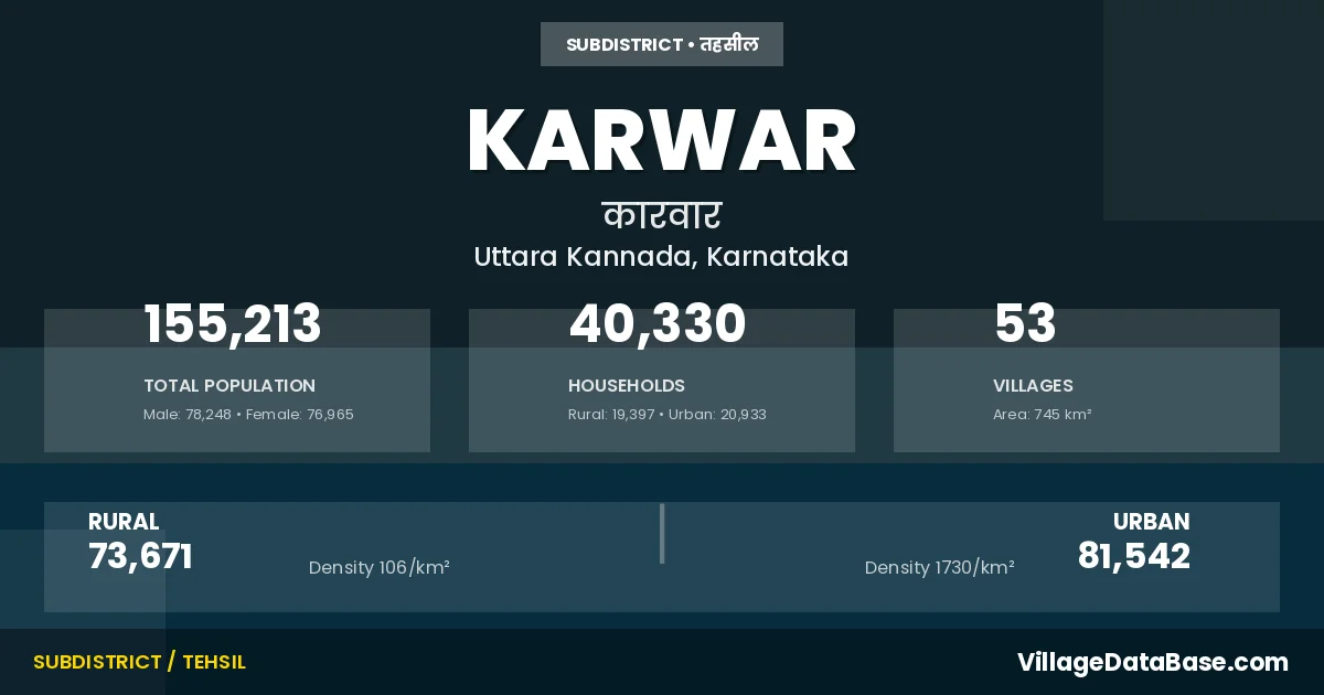 According to the 2011 census The total area of Karwar Taluka is 745 km², with a population of 155213 people. The population density is 208 inhabitants per square kilometre, and there are approximately 40330 houses in the sub district.