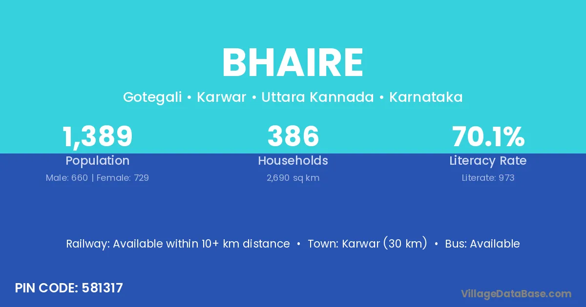 Karwar (30 km) is the nearest town to Bhaire village for major economic activities and is located approximately 30 km away.