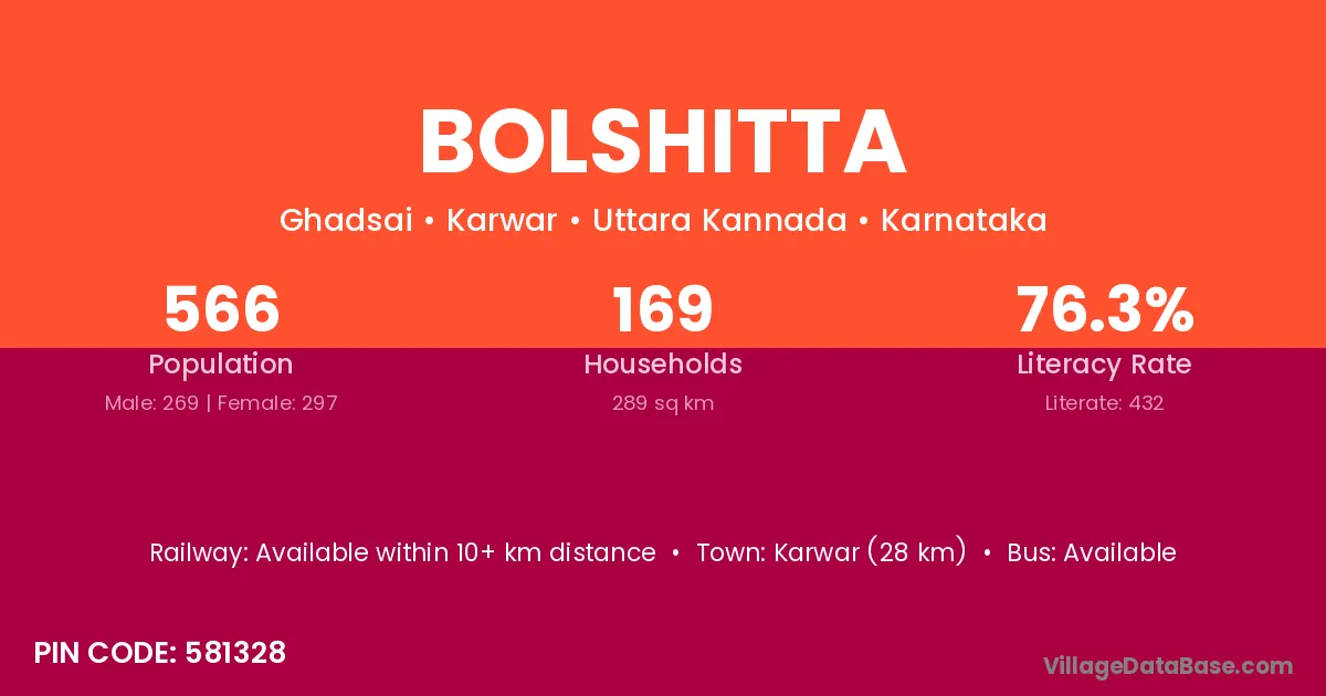 Karwar (28 km) is the nearest town to Bolshitta village for major economic activities and is located approximately 28 km away.