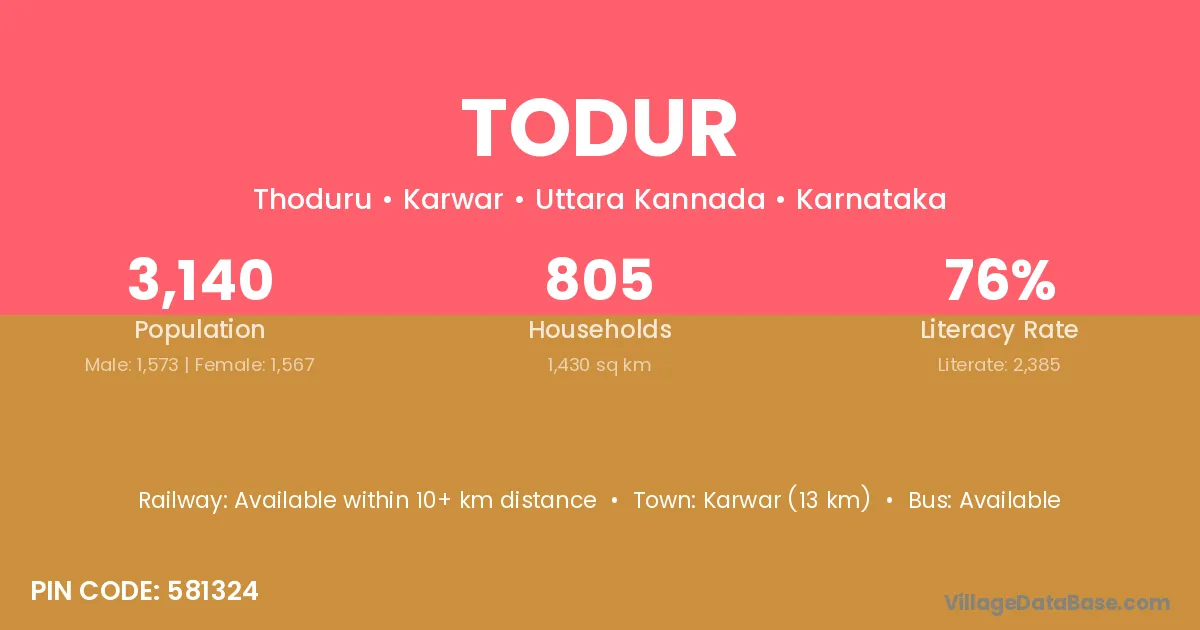 Karwar (13 km) is the nearest town to Todur village for major economic activities and is located approximately 13 km away.