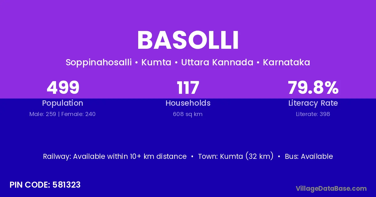 Kumta (32 km) is the nearest town to Basolli village for major economic activities and is located approximately 32 km away.