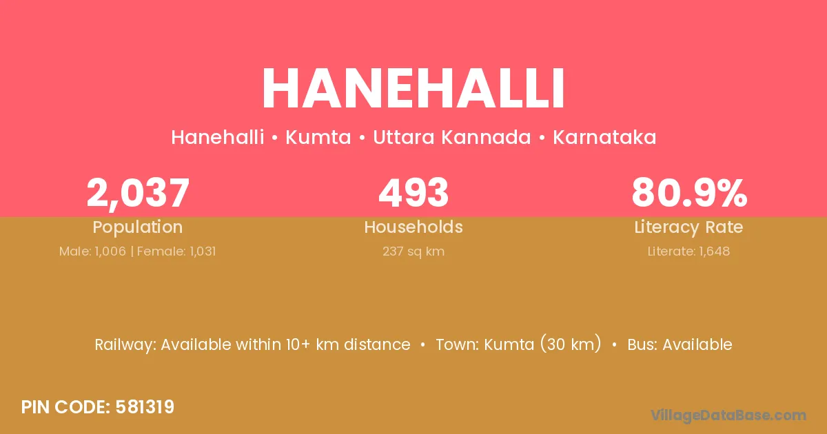 Kumta (30 km) is the nearest town to Hanehalli village for major economic activities and is located approximately 30 km away.