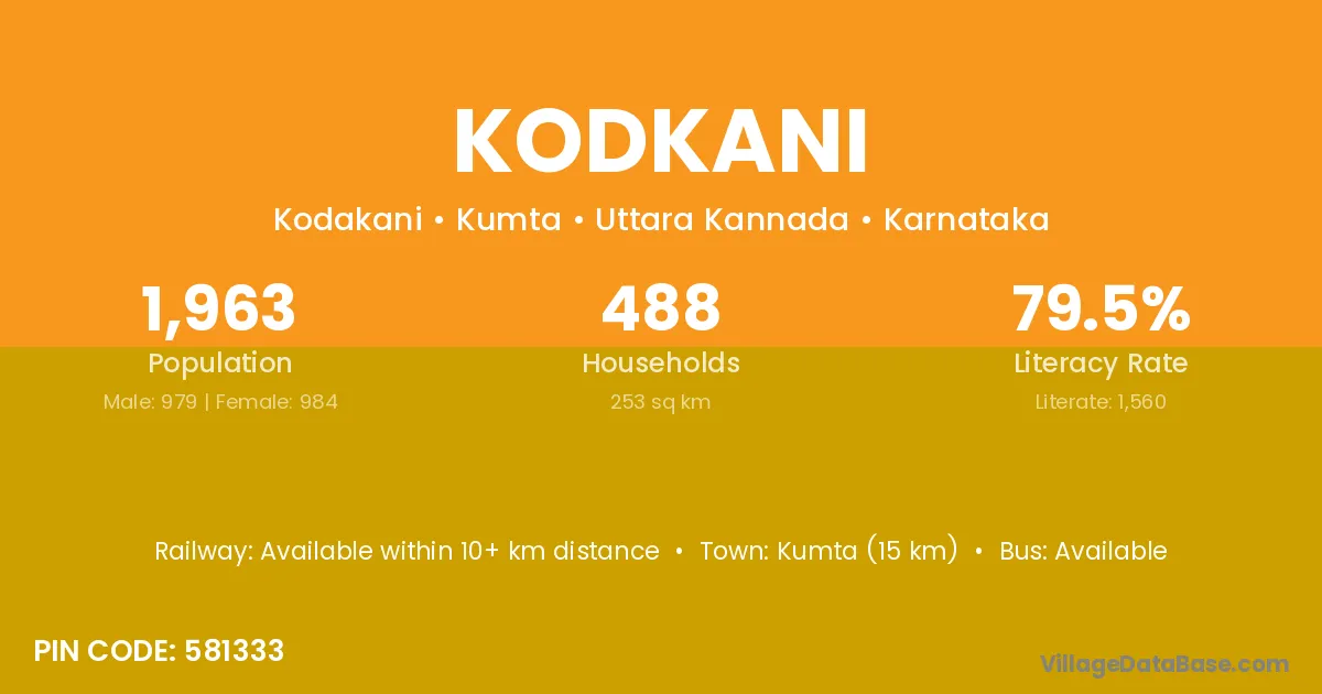 Kumta (15 km) is the nearest town to Kodkani village for major economic activities and is located approximately 15 km away.