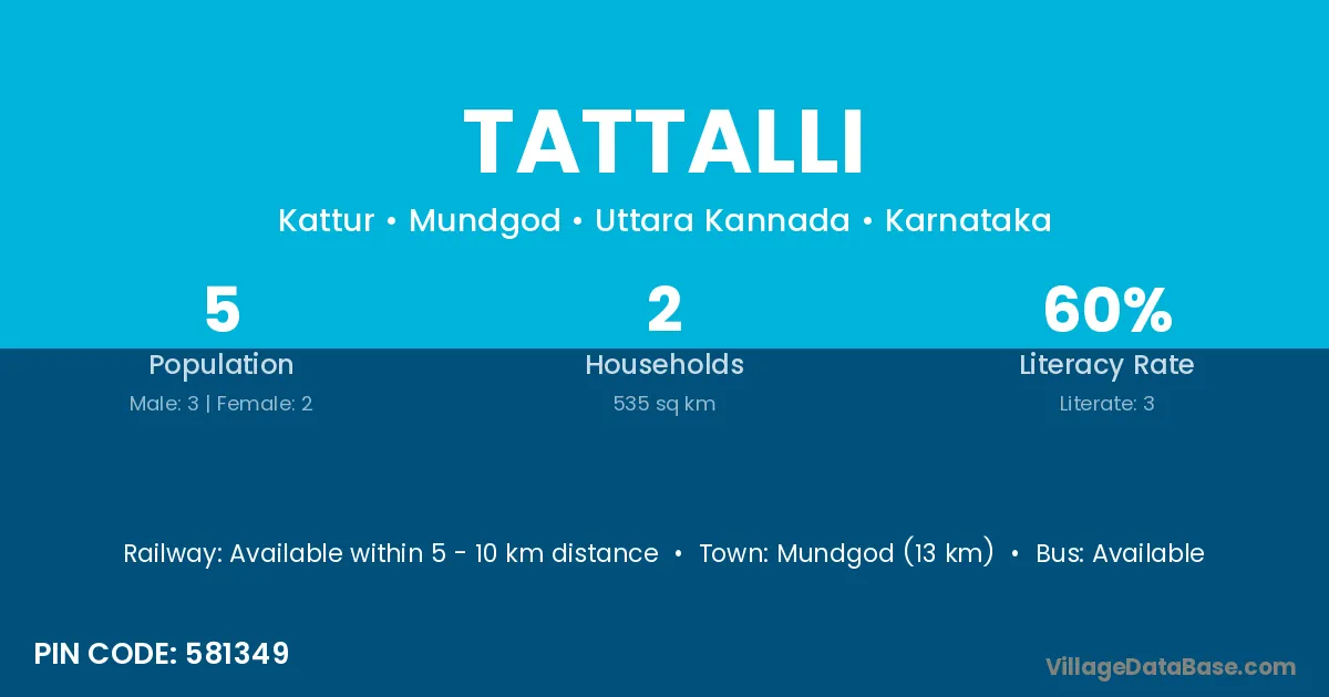 Mundgod (13 km) is the nearest town to Tattalli village for major economic activities and is located approximately 13 km away.