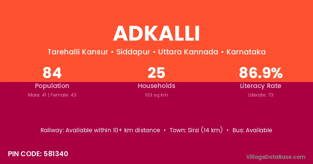 Sirsi (14 km) is the nearest town to Adkalli village for major economic activities and is located approximately 14 km away.