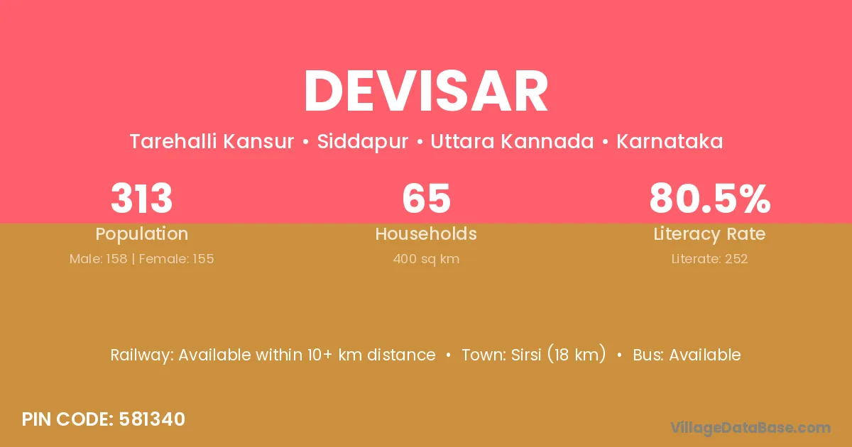 Sirsi (18 km) is the nearest town to Devisar village for major economic activities and is located approximately 18 km away.