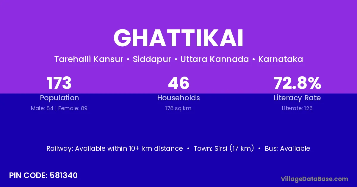 Sirsi (17 km) is the nearest town to Ghattikai village for major economic activities and is located approximately 17 km away.