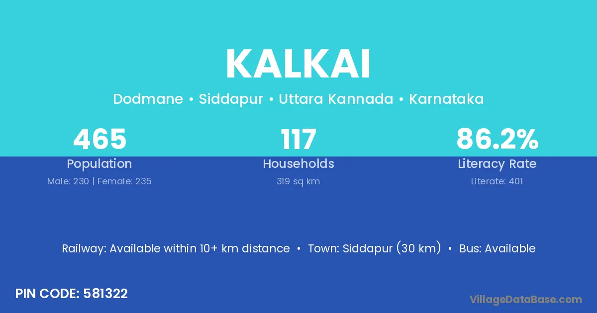 Siddapur (30 km) is the nearest town to Kalkai village for major economic activities and is located approximately 30 km away.